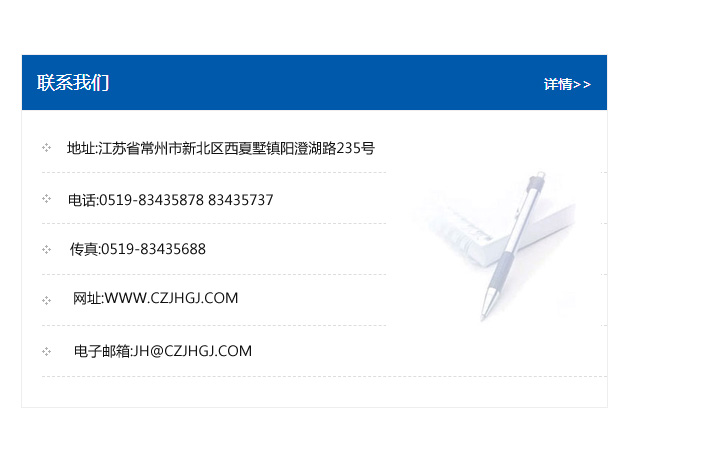 地址:常州市新北區友邦商務大廈1幢16、17層  電話:0519-85101652  傳真:0519-85112595  郵編:213022  網址:www.cz-jiayue_cn.qzglyt.com  郵箱:xiajifengaa@163.com
